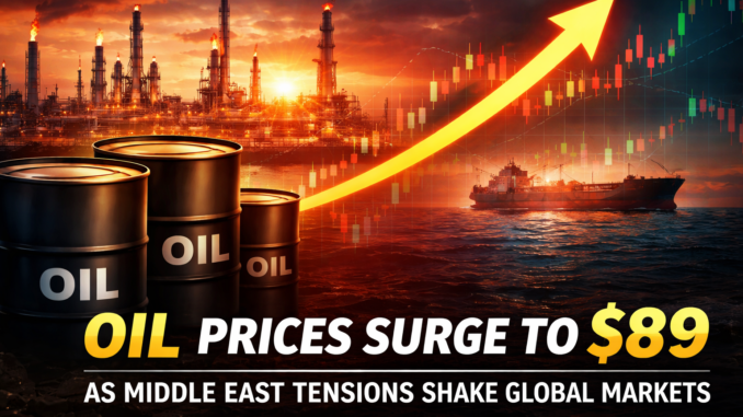 Global oil markets experienced significant volatility this week as crude oil prices surged toward $89 per barrel, marking one of the strongest weekly increases in recent years. The price spike has been driven largely by rising geopolitical tensions in the Middle East, a region that plays a crucial role in global energy supply.